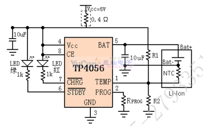 熱反饋可對充電電流進行自動調(diào)節(jié),以便在大功率操作或高環(huán)境溫度條件下對芯片溫度加以限制。充電電壓固定于4.2V,而充電電流可通過一個電阻器進行外部設置。當充電電流在達到最終浮充電壓之后降至設定值1/10時,TP4056將自動終止充電循環(huán)。